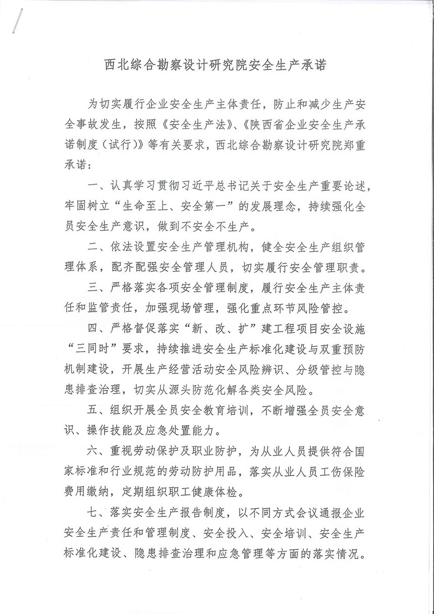 鸿泰棋牌 >> 新闻资讯 >>鸿泰棋牌的公告 >> 西北综合勘察设计研究院安全生产承诺